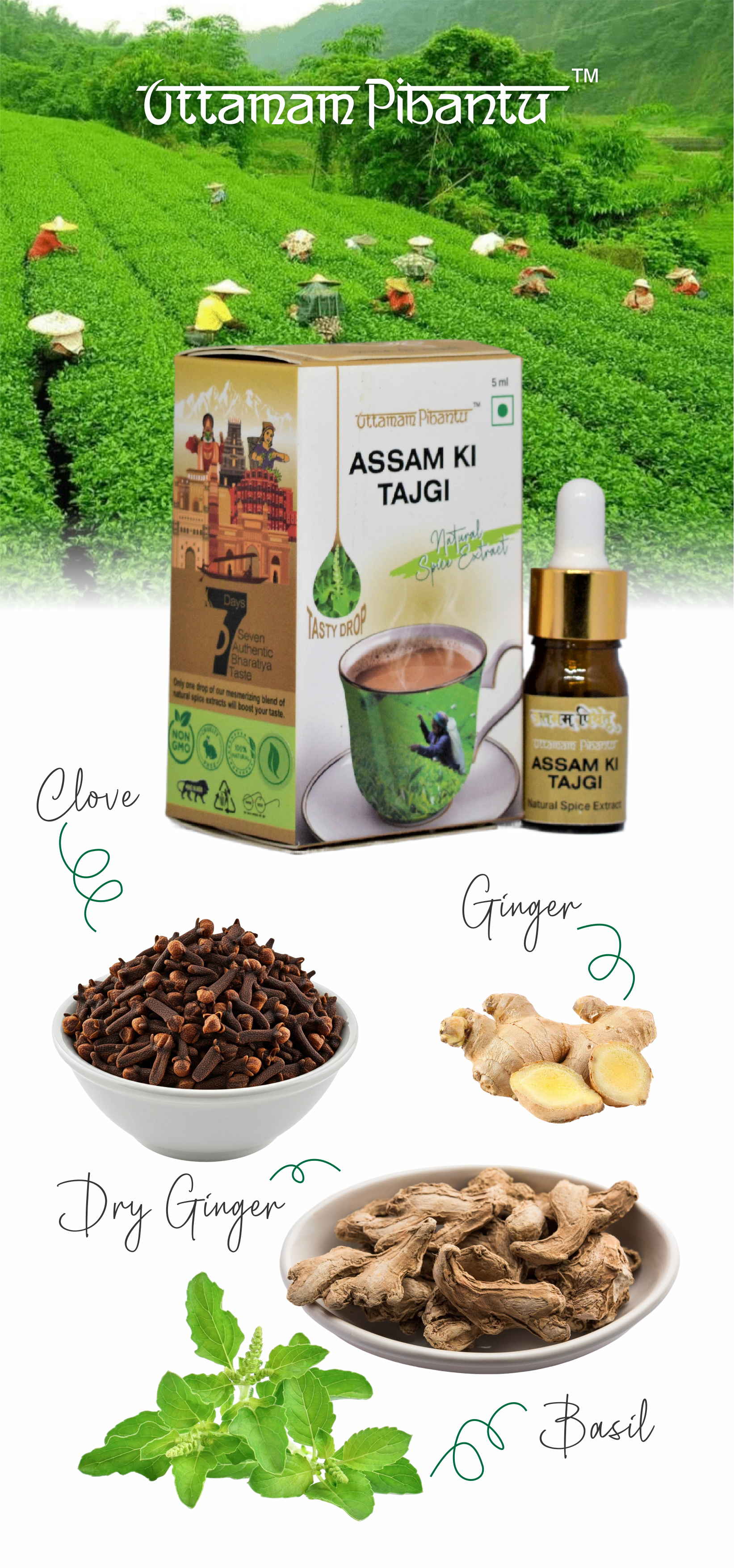 Experience the refreshing taste of Assame Ginger with Assam Ki Tajagi, a blend of ginger, clove, basil, and spearmint. extracts. Just one drop of this natural infusion transforms your tea into a delig Read More